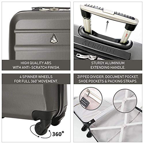 Aerolite ist stolz, einige der weltweit leichtesten Koffersets anbieten zu kšnnen, die Millionen von Reisenden in der ganzen Welt zu einem noch angenehmeren Reiseerlebnis verhelfen. Sie ganz sicher den perfekten Reisepartner finden. Vier wendige Rollen erlauben reibungslose 360-Grad-Bewegungen, wŠhrend der versenkbare doppelrohrige GepŠckhandgriff (Druckknopfmechanismus) nicht nur unkomplizierten und einfachen Transport, sondern auch das kinderleichte Balancieren von GegenstŠnden auf der Oberseite mšglich macht. Der Au§enmantel besteht aus einer langlebigen, jedoch leichtgewichtigen kratzfesten ABS Hartschale, um den Inhalt gegen die harten Anforderungen beim Reisen zu schŸtzen. Robuste, leichtgŠngige, breite Rei§verschlŸsse lassen das …ffnen und Schlie§en des Koffers zum Kinderspiel werden. Die Innenausstattung bietet Packgurte und interne Rei§verschlussfŠcher, die sŠmtliches GepŠck wŠhrend des Transports vor dem Verrutschen bewahren. ZusŠtzliche bietet es eine spezielle elastische Tasche, die sich perfekt fŸr Schuhe eignet. Jeder Koffer besitzt ein kostenlos mitgeliefertes Zylinderschloss mit 3-stelliger Zahlenkombination, um Rei§verschlŸsse zusammenhalten und Ihnen so zusŠtzliche Sicherheit bieten zu kšnnen. Mit seiner fantastischen 5 Jahre Garantie (fŸr Herstellungsfehler) biete Ihnen der Koffer absolute Sicherheit!