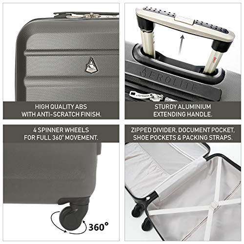 Aerolite is dafür bekannt, sehr leichte Koffer zu produzieren und somit tausenden von Urlaubern dabei zu helfen, Gewichtsbeschränkungen am Check-in-Gate einzuhalten. Durch das reduzierte Gesamtgewicht des Koffers können Reisende mehr mitnehmen und vermeiden zugleich Übergewichtkosten. Hier finden Sie mit Sicherheit Ihren perfekten Reisebegleiter. Vier wendige Rollen garantieren eine einwandfreie 360 Grad Bewegung, während der versenkbare doppelrohrige Gepäckhandgriff (Druckknopfmechanismus) nicht nur unkomplizierten und einfachen Transport, sondern auch das kinderleichte Platzieren von Gegenständen auf der Obrseite des Koffers ermöglicht. Das Hartschalengehäuse besteht aus strapazierfähigem, kratzfestem ABS Material, um den Inhalt bestens auf Reisen zu schützen. Robuste, leichtgängige, breite Reißverschlüsse vereinfachen das Öffnen und Schließen des Gepäcks. Die Innenausstattung bietet Packgurte und interne Reißverschlussfächer, die sämtliches Gepäck während des Transports vor dem Verrutschen bewahren. Zusätzlich ist eine spezielle elastische Tasche integriert, die sich perfekt für Schuhe eignet. Jeder Koffer besitzt ein kostenlos mitgeliefertes Zylinderschloss mit 3-stelliger Zahlenkombination, um Reißverschlüsse zusammenzuhalten und Ihnen so zusätzliche Sicherheit zu bieten. Mit seiner fantastischen 5 Jahre Garantie (für Herstellungsfehler) bietet Ihnen der Koffer absolute Sicherheit!