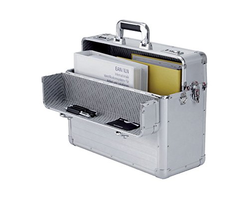 Pilotenkoffer BETHA glattes Aluminium, abnehmbarer Schulterriemen, zwei Zahlenkombinationsschlösser, seitliche Schnappverschlüsse, Heavy-Duty-Griff. Innen: Laptopfach, Hängeregistervorrichtung, drei Schreibgeräteschlaufen, zwei Visitenkartenfächern.