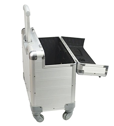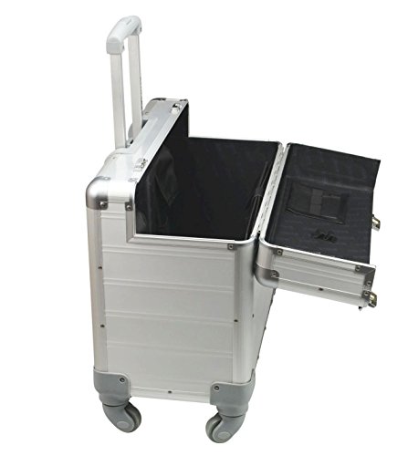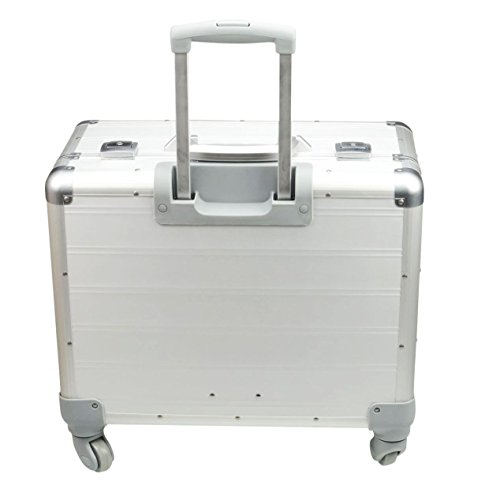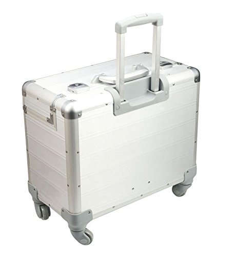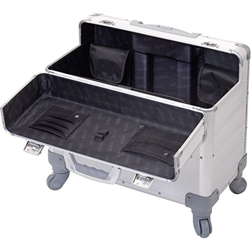 Edles Aluminium, vier 360° Leichtlaufrollen, integriertes arretierbares Teleskoptrolleysystem, ergonomischer Tragegriff, verstärkte Kanten, sicheres Schlosssystem mit Zweifachschließung und Öffnungsautomatik, herausnehmbares strukturiertes Inlay, acht Visitenkartenfächer, zwei SD Kartenfächer, Ladekabelfach, zwei Stiftschlaufen, Netztasche, Handytasche, Tabletfach, zwei herausnehmbare Organizertaschen, Im Deckel vier Visitenkartenfächer, zwei SD Kartenfächer, Netztasche