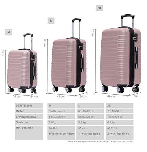Ein hochwertiges Trolleyset mit vielfältigen Funktionen – Topdesign – 4 Zwillingsrollen mit 360°- rundum – Leichtlauf – Fahrwerk – Trennwand im Innenraum – Integriertes Sicherheits-Zahlenschloss – Hochwertige Höhenverstellbare Telekopgriff – leichte ABS-Kunststoff Hartschale – Mehr Volumen durch Dehnungsfuge: Doppelreißverschluss für 25% mehr Volumen Mass- und Gewichtsangaben ca.: (inkl. Rollen und Griffe) Grösse XL (76cm): Aussenmassen:76 x 52 x 32cm (H x B x T) Innemassen :68x 47x 30cm (H x B x T) Gewicht: 4,10 kg Volumen: min. 115 L Grösse L (65cm): Aussenmassen:65 x 46 x 29cm (H x B x T) Innemassen :58 x 43 x 24cm (H x B x T) Gewicht: 3,5 kg Volumen: min. 75 L Grösse M (55cm): Aussenmassen: 55 x 39 x 25cm (H x B x T) Innemassen : 48 x 35 x 21cm (H x B x T) Gewicht: 2,8 kg Volumen: min. 45 L Die angegebenen Planenmaße sind immer in „Schnittgrößen“ mit einer üblichen Toleranz von ca. +/- 1-2% aber max.mit ca. 2cm Maßabweichungen angegeben. Das tatsächliche Nutzmaß kann hierbei also etwas vom angegebenen Nennmaß abweichen. Dies ist Industriestandard!