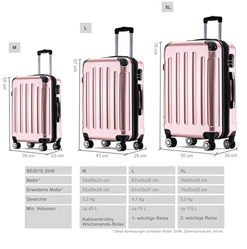 Produktbeschreibung: Mehr Volumen durch Dehnungsfuge: Dehnfalte sorgt für 25% mehr Volumen SicherheitEin integrierter Zahlenschloss öffnen Sie bequem mit einem drei- oder vierstelligen Code Komfortabler Transport4 gummierte Zwillingsrollen mit 360° drehbarer Funktion Hochwertige Höhenverstellbare Teleskopgriff Angenehmer TragekomfortTragegriffe an der Ober- und Längsseite 4 Kunststoff-Füße an der Längsseite Stoßfestes Material4 Stückige Kantenschutz an der vorderen Hart-schale Oberflächenglanz aus ABS + Polycarbonat Organisierter InnenraumReißverschlussfach im Packraum Trennwand mit Reißverschluss und zusätzlichem Netzfach Kreuzspanngurte in beiden Schalenhälften Maß- und GewichtsangabenGrösse XL (76cm): Aussenmassen: 76x48x30cmInnemassen : 68x45x26cmGewicht: 5,20 kg Max. Volumen: 120 Liter (mit Volumenerweiterung) Min. Volumen: 100 Liter Liter Grösse L (66cm): Aussenmassen: 66x46x24cmInnemassen : 55x39x23cmGewicht: 4,2 kg Max. Volumen: 75 Liter (mit Volumenerweiterung) Min. Volumen: 65 Liter Grösse M (55cm)-KEIN SEITLICHER GRIFF: Aussenmassen:55x39x23cm Innemassen : 48x35x20cm Gewicht: 3,3 kg Max. Volumen: 45 Liter (mit Volumenerweiterung) Min. Volumen: 35 Liter