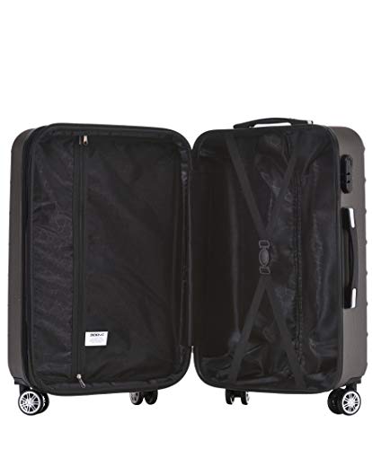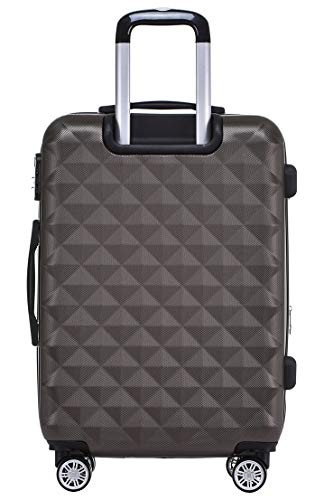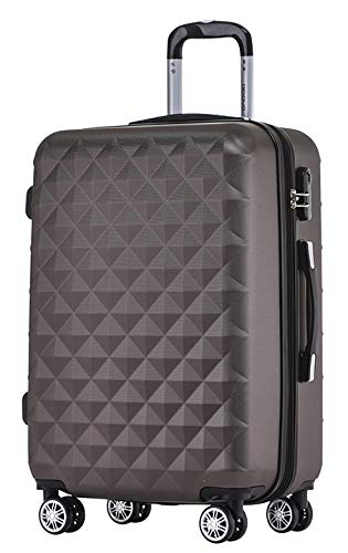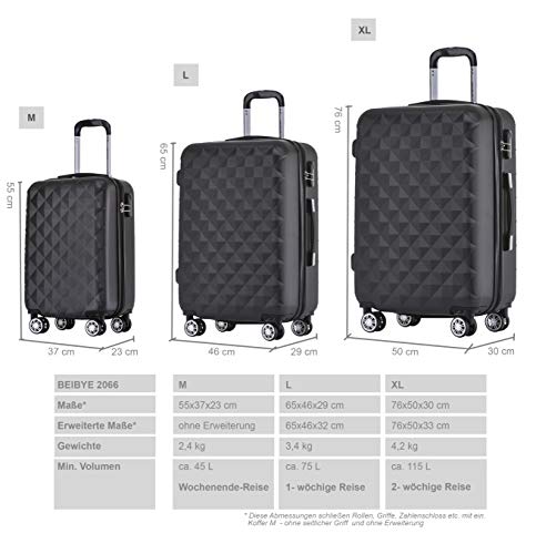 Ein hochwertiges Trolleyset mit vielfältigen Funktionen – Topdesign – 4 Zwillingsrollen mit 360°- rundum – Leichtlauf – Fahrwerk – Trennwand im Innenraum – Integriertes Sicherheits-Zahlenschloss – Hochwertige Höhenverstellbare Telekopgriff – leichte ABS-Kunststoff Hartschale – Mehr Volumen durch Dehnungsfuge: Doppelreißverschluss für 25% mehr Volumen Mass- und Gewichtsangaben ca.: (inkl. Rollen und Griffe) Grösse XL (76cm): Aussenmassen:76 x 52 x 32cm (H x B x T) Innemassen :68x 47x 30cm (H x B x T) Gewicht: 4,60 kg Volumen: min. 115 L Grösse L (65cm): Aussenmassen:65 x 46 x 29cm (H x B x T) Innemassen :58 x 43 x 24cm (H x B x T) Gewicht: 3,8 kg Volumen: min. 75 L Grösse M (55cm): Aussenmassen: 55 x 34 x 22cm (H x B x T) Innemassen : 48 x 32 x 20cm (H x B x T) Gewicht: 3,0 kg Volumen: min. 45 L (kein Dehnungsfuge und kein seitlicher Griff ) Die angegebenen Planenmaße sind immer in „Schnittgrößen“ mit einer üblichen Toleranz von ca. +/- 1-2% aber max.mit ca. 2cm Maßabweichungen angegeben. Das tatsächliche Nutzmaß kann hierbei also etwas vom angegebenen Nennmaß abweichen. Dies ist Industriestandard!