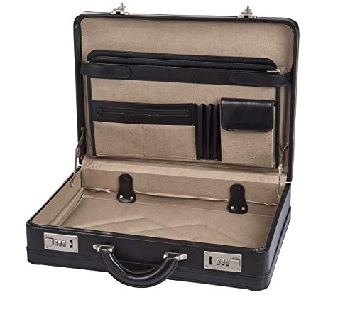 Business Aktenkoffer – Material: Lederfaserstoff. Außenmaße ca. 44 x 34 x 11 cm + ca. 2 cm Dehnfalte – Gewicht ca. 2,6 kg – Volumen ca. 20 Liter. Vielseitiger Organizer Einteilung – Platz für Laptop, DIN A4 Ordner – 1 Hauptfach – Tragegriff – 2 x integriertes Zahlenschloss. Ohne abgebildeten Inhalt.