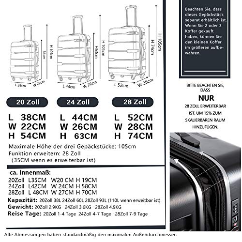 Unser 20-Zoll-Koffer ist so konzipiert, dass er den Reisenden Komfort, Funktionalität, Zuverlässigkeit und Sicherheit bietet. Er eignet sich für den Transport in Flugzeuge. Perfekt für Geschäfts- und Urlaubsreisende, modische Reisende und für Reisende, die gerne reisen.Der Koffer profitiert enorm von der Hartschale aus ABS + PC. Es eignet sich hervorragend für den strengen modernen Transport und die grobe Behandlung durch Gepäckabfertiger. Wir sind bestrebt, Millionen von Reisenden auf der ganzen Welt dabei zu helfen, mehr von ihrer glücklichen Reiseerfahrung zu genießen.Merkmale des Gepäcks. 28 Zoll ist erweiterbar für bis zu 15% zusätzliche Verpackungskapazität; 20inch ist perfekt für unterwegs, 24inch ist ideal für private oder geschäftliche Reisen..Griff: 3-stufiger Teleskopgriff aus reinem Aluminium für komfortables Manövrieren.Räder: Mit vier Schleuderrädern kann sich der Koffer nahtlos über 360 Grad bewegen.Innenraum: Der Innenraum ist komplett mit vielseitigen Organisationstaschen ausgekleidet, die das Packen von Kleidung erleichtern.Kapazität: 20Zoll 38L 24Zoll 60L 28Zoll 93L (110L wenn erweitbar ist)Gewicht: 20Zoll 2.9KG 24Zoll 3.6KG 28Zoll 4.9KGReise Tage: 20Zoll 1-4 Tage 24Zoll 4-7 Tage 28Zoll 7-9 Tage