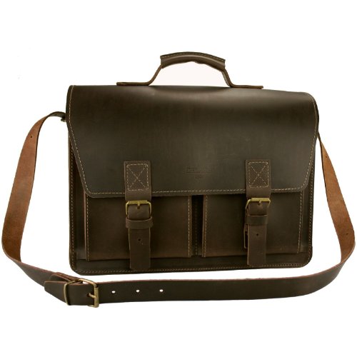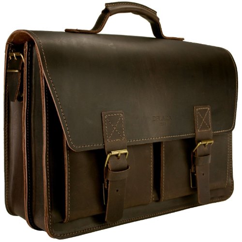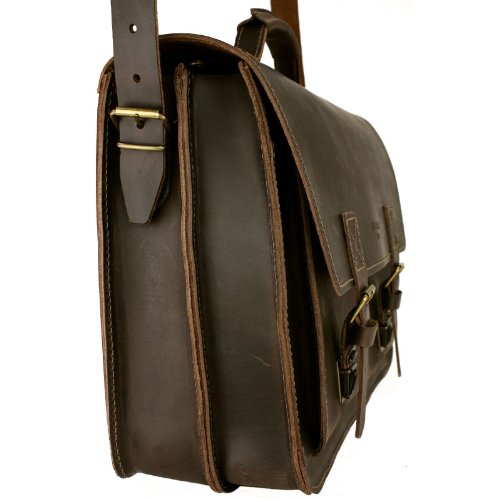 Das Original von DELARA. Nach alten Bauhaus-Originalplänen gefertigt. Made in Germany. Aktentasche aus dickem, sehr robustem Rangerleder (auch Sattelleder genannt, vegetabil gegerbtes Rindsleder, durchgefärbt, gefettet). Verschluss mit zwei Schnappschlössern auf der Vorderseite der Tasche. Innen zwei geräumige Fächer, dazwischen ein Fach mit Reißverschluss. Zwei aufgesetzte Fächer auf der Vorderseite. Ein Laptop mit den Maßen bis zu (H/B/T): 6/35/28 passt bequem hinein (es passen sogar zwei Laptops hinein, in jedes der Fächer einer!). Außerdem bleibt noch genug Platz für DIN A4-Dokumente und Laptop-Zubehör (z.B.: Maus, Netzteil, CDs etc.). Ein Schulterriemen aus Leder (bis ca. 130 cm lang, in der Länge verstellbar) wird mitgeliefert. Tiefe der großen Innenfächer: ca. 5 und 6 cm Maße (Höhe/Breite/Tiefe in cm): ca. 30/40/15 Gewicht: 1,9 kg Gratis-Zubehör: Ein Schulterpolster aus Ranger-Leder