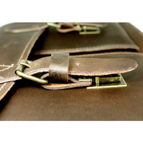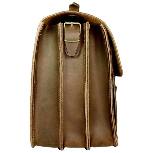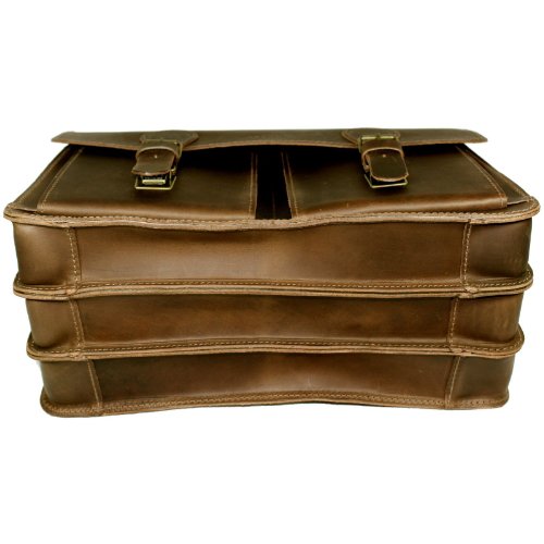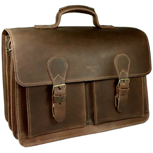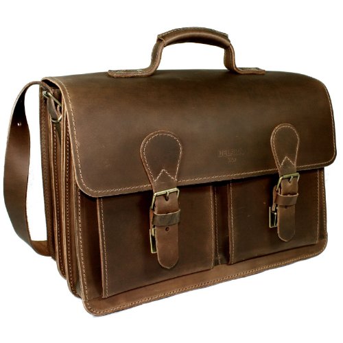 Handarbeit – MADE IN GERMANY Sehr geräumige Aktentasche aus dickem, robusten Ranger-Leder (vegetabil gegerbtes Rindleder, durchgefärbt, gefettet, auch Sattelleder genannt. Stärke 2,0-2,5 mm). Verschluss mit zwei Schnappschlössern auf der Vorderseite der Tasche. Innen drei geräumige Fächer, dazwischen ein Fach mit Reißverschluss. Zwei aufgesetzte Taschen auf der Vorderseite.Ein Laptop mit einem Display bis 16 Zoll passt bequem hinein (es passen sogar drei Laptops hinein, in jedes der Fach einer!). Außerdem bleibt noch genug Platz für zwei Leitz-Ordner, DIN A4-Dokumente und Laptop-Zubehör (z.B.: Maus, Netzteil, CDs etc.). Zubehör:- Ein in der Länge verstellbarer Schulterriemen (bis ca. 130 cm lang) aus Ranger-Leder- Ein handgearbeitetes Schulterpolster aus Ranger-Leder Außenmaße der Tasche: (Höhe/Breite/Tiefe in cm): 32/42/20. Höhe ohne Griff gemessen.Gewicht: 2,2 kg.