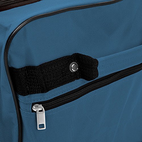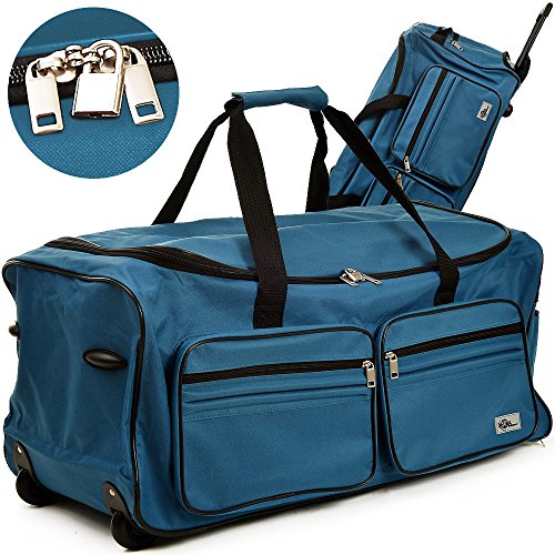 Die Tasche gibt es in den Farben schwarz, rot, orange und hellblau. Produktvorteile 160 Liter: – 3 Rollen inkl. Kugellager – 3 Außentaschen – 5 Standfüße an der Unterseite – Doppeltragegriff mit Klettverschluss – zusätzlicher Tragegriff an der Seite – ausziehbarer Teleskopgriff lässt sich bei Nichtgebrauch hinter einer Abdeckung versenken – robust & strapazierfähig Technische Daten 160 Liter: – Abmessungen: 85 x 43 x 44 cm (LxBxH) – Füllmenge: 160 Liter – Material: 600D Polyester mit PVC-Beschichtung – Farbe: schwarz, rot, orange und hellblau Produktvorteile 85 Liter: – 2 Rollen inkl. Kugellager – 3 Außentaschen – 5 Standfüße an der Unterseite – Doppeltragegriff mit Klettverschluss – zusätzlicher Tragegriff an der Seite – ausziehbarer Teleskopgriff lässt sich bei Nichtgebrauch hinter einer Abdeckung versenken – robust & strapazierfähig Technische Daten 85 Liter: – Abmessungen: 70 x 36 x 34 cm (LxBxH) – Füllmenge: 85 Liter – Belastbarkeit bis 15 kg – Material: 600D Polyester mit PVC-Beschichtung – Farbe: schwarz, rot, orange und hellblau Lieferumfang: – 1 x Reisetasche inkl. Hängeschloss nach Ihrer Farb,- Größenwahl und Anzahl