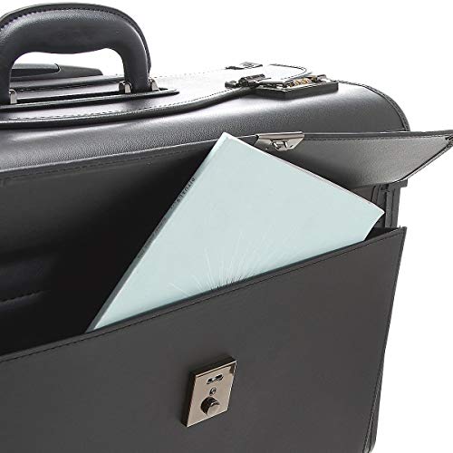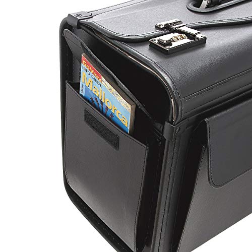 hochwertig verarbeiteter Pilotenkoffer aus robustem Polyurethan ein bequemer Tragegriff ein versenkbarer, arretierbarer Teleskopgriff zwei Inline-Rollen je eine Seitentasche mit Überschlag und Klettverschluss eine große abschließbare Vortasche das geräumige Hauptfach kann mittels zweier Zahlenschlösser gesichert werden es enthält zwei Trennwände, vier Stifthalter und zwei kleine Steckfächer