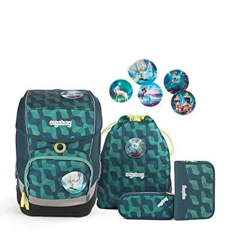 Ergobag Cubo Schulranzen-Set 5-tlg Set bestehend aus: – Ergobag Cubo Schulranzen – Sportbeutel – 5-tlg. Klettiesset – Schlamperrolle – Federmäppchen, gefüllt Bücher, Hefte, Mäppchen … In der Summe wird ein Kinderrücken auf dem Schulweg durch ein stattliches Gewicht belastet. Eine wichtige Ursache für spätere Rückenprobleme liegt in unvorteilhafter Belastung im Kindesalter. Die neue Produktlinie cubo von ergobag kombiniert die klassische Form traditioneller Schulranzen mit dem innovativen Tragesystem des beliebten ergobag-schulrucksacks. Anspruchvolles Design, Qualität, Funktionalität und Liebe zum Detail zeichnen auch diese Neuheit von ergobag aus. Besonderheiten auf einen Blick -Der hochformatige Ranzen bietet viel Armbewegungsfreiheit für kleine cubo-Träger -stabile Beckenflossen sichern die Gewichtsverlagerung auf den Beckenbereich -Der cubo lässt sich genau auf die Körpergröße des Kindes einstellen und wächst mit: 1,10 m bis 1,50 m. -Leichte Handhabung des Deckels durch selbstschließenden Magnetverschluss -Standfester und Wasserdichter Boden. -Fronttasche mit Trinkflaschenhalter und Platz für eine Brotdose. -Zwei Innenfächer mit Reißverschluss: eines für das separat erhältliche Regencape und das andere für Kleinigkeiten. Außenausstattung Schulrucksack: – 2 ergonomische und gepolsterte Schultergurte, in der Länge variabel verstellbar – gepolsterter Beckengurt, abnehmbar – 1 Tragegriff – fixierender Brustgurt, abnehmbar – Trägeraufhengung kann jedem Wachstumsschub mit angepasst werden – 1 Reißverschluss-Vortasche mit Flaschenhalterung und Platz für eine Brotdose – Schloss lässt sich mit einer Hand öffnen und zu schließen – aufgenähte Reißverschlüsse nur passend für