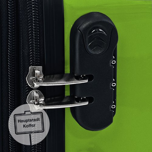 Durch die modische und außergewöhnliche Farbgestaltung gehört die lästige Koffersuche auf den Gepäckbändern der Vergangenheit an. Das Kofferset von Hauptstadtkoffer hat den absoluten Wiedererkennungswert und besticht durch sein exzellentes Preis-/Leistungsverhältnis. Wir wünschen Ihnen viel Spaß mit Ihrem Hauptstadtkoffer Ausstattungsmerkmale: + ausziehbare Teleskopstange aus eloxiertem Alu mit ergonomischem Griff, ermöglicht ein leichtes Ziehen + separate Tragegriffe an Ober- und Längsseite + zusätzliche Abstellvorrichtung auf der Längsseite (oberflächenschonend bei flexibler Nutzung) + flexibler Zwischenboden mit seperate Netztasche zur Trennung des Inhaltes + 4 cm Dehnfalte für Volumenerweiterung + Zahlenschloss mit verstellbarem Code + Hauptfach ist mit Stoff ausgelegt + Kreuzgurt zum Sichern des Inhaltes + VIER gummierte 360° Leichtlaufrollen (kugelgelagert) für sehr hohen Rollkomfort Material: Polycarbonat + ABS superleichtes und besonders robustes Material Lieferumfang: Koffer (Handgepäck* 45 Liter):(HxBxT) ca. 55 x 35 x 20 cm mit Griffen und Rollen (erweiterbar auf 55 x 35 x 24 cm) Gewicht ca. 3.2 Kg max., Inhalt ca. 45 Liter Inklusive: Cabin Liquid Bag, um Flüssigkeiten im Handgepäck zu transportieren Koffer (87 Liter):(HxBxT) ca. 63 x 42 x 28 cm mit Griffen und Rollen (erweiterbar auf 63 x 42 x 32 cm) Gewicht ca. 4.2 Kg max., Inhalt ca. 87 Liter Koffer (130 Liter):(HxBxT) ca. 75 x 52 x 32 cm mit Griffen und Rollen (erweiterbar auf 75 x 52 x 36 cm) Gewicht ca. 5.2 Kg max., Inhalt ca. 130 Liter *Entspricht dem Handgepäck im Flugzeug mit den Vorgaben: 56 cm x 45 cm x 24 cm (IATA-Empfehlung) bzw. 55 cm x 40 cm x 20 cm