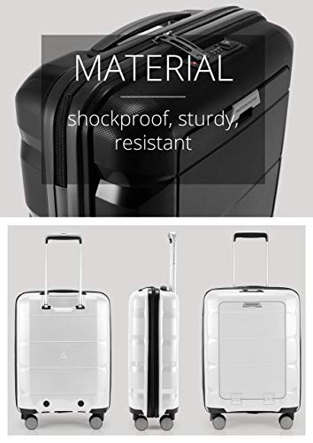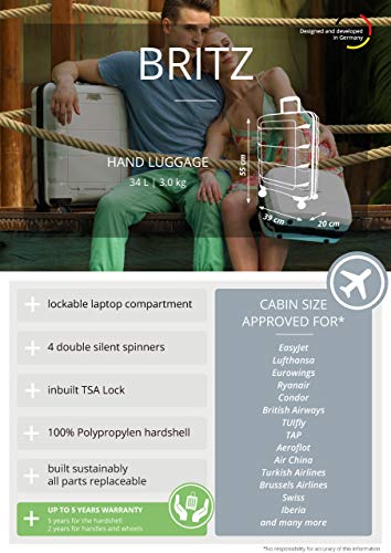 Komfortabler Transport4 gummierte Silence Doppelrollen, 360° drehbar,Teleskopstange mit Druckknopf (2-stufig verstellbar auf 92 / 102 cm)Bequemes HandlingTeleskopstange lässt sich auf jede Körpergröße einstellen, einfache Handhabung für komfortablen Transport,Tragegriff an der Oberseite Stoßfestes MaterialMatte Hartschale aus PP (Polypropylen), wasserabweisendund äußerst pflegeleicht Verschließbares FrontfachLaptopfach mit gepolstertem Steckfach für Tablet oder Laptop (bis zu 13 Zoll)+ RV-Tasche – über TSA-Zahlenschloss verschließbar SicherheitEingelassenes TSA-Zahlenschloss mit einstellbarem Code, Koffer und Frontfach sind über das TSA-Schloss verschließbar Organisiertes InterieurZwischenboden mit Reißverschluss und Netztasche teiltKoffer in zwei Kompartiments, Hauptfach ist mit hochwertigem Nylon ausgekleidet, elastischer Kreuzriemen fixiert das Gepäck zuverlässig VerschlussartBesonders stabiler ReißverschlussIneinander stapelbarKoffergrößen platzsparend verstaubar Besonders nachhaltigGeschraubtes Zubehör (Tragegriffe, Teleskopgriff, Rollen und Standfüße) kann jederzeit nachbestellt werden Ideal für fast jede Airline20 cm Tiefe (IATA-Empfehlung: 55 x 40 x 20 cm) Maß- und GewichtsangabenHandgepäck S (55 cm)Maße mit Rollen und Griffen: 55 x 39 x 20 cmMaße ohne Rollen und Griffen: 49 x 37 x 19 cmGewicht: 2,6 kgMax. Volumen: 34 Liter