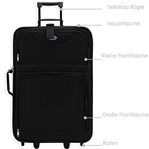 Das KESSER 4er Reisekoffer Set Details Trolley 60 Liter: • 64 x 44 x 21 cm• Ausziehbarer Griff (Stahl Teleskopgriff)• Netztasche mit Reißverschluss• 2 aufgesetzte Aussentaschen• Anbringung von einem Schloss zum Diebstahlschutz möglich• Klickgurt System zum Verbinden mit dem anderen Koffer• Zwei Außentaschen• Rundum Reißverschluss• Innenfach mit Reißverschluss• Kreuzpackgurt zum knitterfreien Transport Ihrer Kleidung• 2 Räder • 2 zusätzliche Gummistandfüsse Details Trolley 34 Liter: • 52 x 37 x 18 cm• Tragegriffe oben und seitlich• 2 aufgesetzte Aussentaschen• Ausziehbarer Griff (Stahl Teleskopgriff)• Anbringung von einem Schloss zum Diebstahlschutz möglich• Klickgurt System zum Verbinden mit dem anderen Koffer• Zwei Außentaschen• Rundum Reißverschluss• Innenfach mit Reißverschluss• Kreuzpackgurt zum knitterfreien Transport Ihrer Kleidung• 2 Gummiräder• 2 zusätzliche Gummistandfüsse Details Schultertasche 16 Liter: • 38 x 28 x 15 cm• Netztasche mit Reißverschluss• Reißverschluss• Tragegriffe oben• Schultergurt• 1 Außentasche Details Kosmetiktasche 3 Liter: • 24 x 10 x 13 cm• Formstabil• Reißverschluss Technische Daten: • Material: 100% Polyester• Trolley 60 L: (LxBxH) 64 x 44 x 21 cm• Trolley 34 L: (LxBxH) 52 x 37 x 18 cm• Schultertasche 16 L: (LxBxH) 38 x 28 x 15 cm• Kosmetiktasche 3 L: (LxBxH) 24 x 10 x 13 cm Lieferumfang: • 4tlg. Kofferset