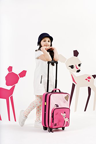 Lässig Trolley für KinderDaten:Maße: Breite ca. 30 cm, Höhe ca. 40 cm, Tiefe ca. 16 cmGewicht: ca. 2 kgFarbe: Fawn (Pink)Tragegriff: Teleskop Trolleysystem, verstellbar von 0 cm – ca. 42 cm (mit Arretierung)Material: 100% PolyesterLieferumfang: Lässig Trolley mit Etikett, Wäschebeutel, sonstige Dekorationen sind nicht Teil des AngebotsAusstattung:Trolley wird mit Two Way Zipper geschlossenDas Hauptfach fixiert das Gepäck mit zwei Gummibändern mit Clip VerschlussDarin zwei Netzeinschubfächer und ein Wäschebeutel mit Zugband (40 x 35 cm)Auf der Vorderseite ein aufgesetztes ZipperfachSeitlich ein Einschubfach mit Zugband und ClipAuf der Rückseite ein Sichtfach mit NamensschildBequemer Tragegriff oben und seitlichLeise RollenDas Lässig Logo ist gut sichtbar eingearbeitetLässig 4Kids Trolley Little Tree – Ein Kinder Trolley mit süßem DesignFunktionalität und lässiger Stil sind bei der Marke Lässig die höchsten Prinzipien. Der Kindertrolley ist ein funktionaler Begleiter und meistert jede Reise: Mit geräumigem Hauptfach, zwei Packriemen und zwei Einschubfächer kann das Gepäck Ihres Kindes im Trolley optimal verstaut werden. Ein separater Beutel für Wäsche oder Schuhe sorgt dafür, dass saubere Kleidung vor Schmutz geschützt ist. Außen seitlich am Koffer kann eine Trinkflasche befestigt werden. Der Lässig 4Kids Trolley Little Tree kann mit individueller Länge des Tragegriffs von Ihrem Kind gezogen werden.