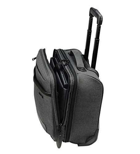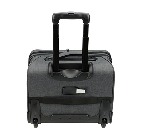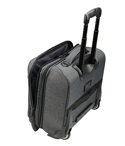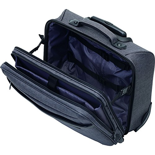 Vollständig versenkbares, arretierbares Trolleysystem, ergonomischer Tragegriff, hochwertige Rollen, Reißverschlusshauptfach, Reißverschlussfach mit gepolstertem Laptopfach und Organizer, mit zwei Stiftschlaufen, drei Visitenkartenfächern, kleine Tasche, zwei Reißverschlussvorfach, verdecktes Adressfeld auf der Rückseite, Trolleyband