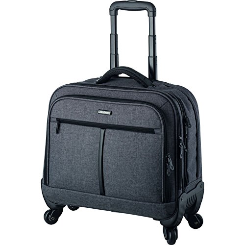 Vollständig versenkbares, arretierbares Trolleysystem, ergonomischer Tragegriff, vier 360° Leichtlauf-Rollen, Reißverschlusshauptfach mit gepolstertem Laptopfach, Reißverschlussfach mit drei Trennfächern, Reißverschlussfach mit Organizer, mit drei Stiftschlaufen, drei Visitenkartenfächern, kleine Tasche, Reißverschlussvorfach, verdecktes Adressfeld auf der Rückseite, Trolleyband