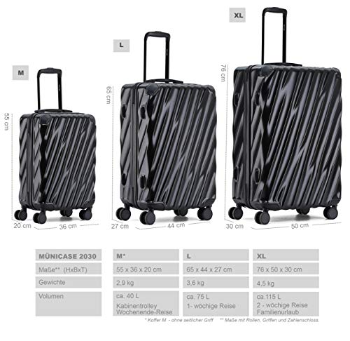 Highlight MÜNICASE-Koffer Serie M2030 supermatt hochwertige Materialen aus Polykarbonat und ABS – robust, absolut stabil und stoßunempfindlich leicht: Alle drei Koffer zusammen wiegen 11 Kg platzsparend: Kabinen-Trolley, mittelgroßer Reisekoffer und großer Koffer sind ineinander stapelbar NACHHALTIGKEIT:hochwertig verschraubtes Zubehör, Ersatzteile im Schadensfall einfach nachbestellbar, selbstständiger Austausch sämtlicher Zubehörteile Maß- und Gewichtsangaben Größe XL (H x B x T) — 2-3 wöchige Reise, Familienurlaub Außenmaße: 76 x 50 x 29,5 cm (inkl. Rollen und Griffen) Innenmaße: 70 x 49 x 28 cm (ohne Rollen und Griffen) Gewicht: 4, 5 kg Größe L (H x B x T) –1-wöchiger Urlaub Außenmaße: 65 x 44 x 26,5 cm (inkl. Rollen und Griffen) Innenmaße: 59 x 41 x 24 cm (ohne Rollen und Griffen) Gewicht: 3, 6 kg Größe M- Business Trolley (H x B x T) — ohne Seitengriff Außenmaße: 55 x 36 x 20 cm (inkl. Rollen und Griffen) Innenmaße: 50 x 34 x 19 cm (ohne Rollen und Griffen) Gewicht: 2, 9 kg