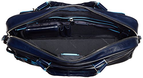 Piquadro BLUE SQUARE, 39 cm, Laptoptasche, blau – (CA2849B2/BLU2) Sie erhalten eine Kurzgrifflaptoptasche mit iPad/iPad®Air-Fach und zwei organisierten RV-Vortaschen. Im Innern sorgt ein großes Hauptfach, passend für A4-Unterlagen für Ordnung. Ebenfalls im Innern befinden sich ein herausnehmbarer Kulturbeutel, Schlüssel- und Stiftehalter sowie ein stoßdämpfender Notebookschutz für Geräte bis 15 Zoll. Weitere Einsteckfächer, teilweise mit Reißverschluss, ein Handyfach sowie ein Fach für Kreditkarten runden das Profil ab. Außen sorgt ein Logoschriftzug auf der Vorderseite, Beschläge aus silberfarbenem Metall für Aufsehen. Mehrere Seitentaschen lassen alles ordentlich verstauen. Ein verstellbarer Schultergurt (von 60-120 cm Länge) sowie zwei Tragegriffe machen das Produkt perfekt. Damit Ihre Tasche nicht verloren geht, ist diese mit einem Adressanhänger versehen. Und sollten Sie mit viel Gepäck unterwegs sein – kein Problem, denn diese Tasche ist auf jedes handelsübliche Trolleygestänge aufsteckbar.