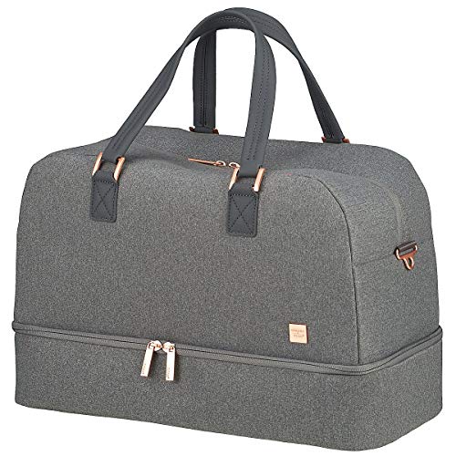 Damit macht der nächste Wochenendtrip erst richtig Spaß. Die hochwertige und wasserabweisende Oberfläche in edler Filzoptik prägen das zurückhaltende Design des Weekenders. In besonderem Kontrast stehen die diversen Applikationen in Roségold, die dem Weekender einen einzigartigen Charakter verleihen. Besonders praktisch ist das große, separate Bodenfach. Hier lassen sich bequem mehrere Paar Schuhe getrennt von weiterem Gepäck unterbringen. Im Inneren überzeugt das hochwertige Futter in frischem Koralle. Dank der zwei großen Trageriemen und dem abnehmbaren Schultergurt lässt sich der Weekender bequem an der Hand oder über die Schulter tragen. Ein besonderes Highlight: Der Weekender lässt sich auf das Trolleygestänge aufstecken und kann so bequem mit zum Ziel rollen.Dezentes Design in edler, grauer FilzoptikWasserabweisende OberflächeZahlreiche Highlights in Roségold Hochwertiges Innenfutter in frischem Koralle Großes, separates Bodenfach für Schuhe & Co.Zwei stabile TrageriemenAbnehmbarer, verstellbarer Schultergurt Praktische Aufsteckfunktion auf der Rückseite Erfüllt die Bordgepäckmaße für die meisten Fluggesellschaften