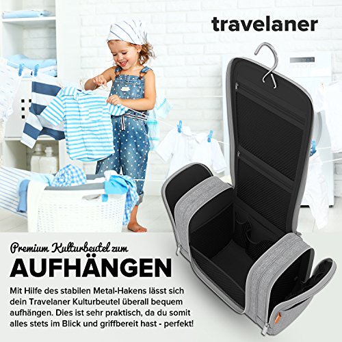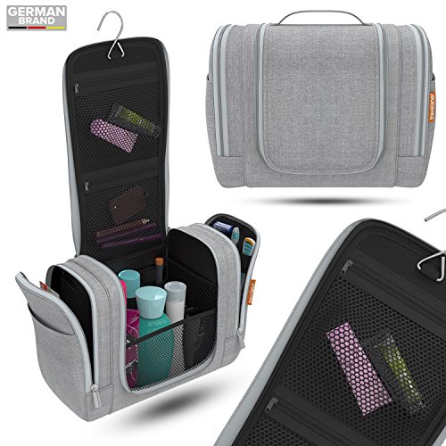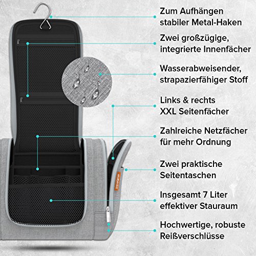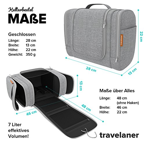„Travelaner Kulturbeutel – Weil du zu smart bist für eine herkömmliche Waschtasche!“ Warum Travelaner? 1. UNISEX – Perfekt geeignet für Frauen, Männer und Kinder2. HOCHWERTIGSTE MATERIALIEN – Für maximale Langlebigkeit3. JEDE MENGE PLATZ – Insgesamt 7 Liter! Stauraum4. ALLES IM BLICK – Zahlreiche übersichtlich und logisch angeordnete Fächer und Innentaschen5. ZUM AUFHÄNGEN – Stabiler & robust verarbeiteter Metal-Haken6. ORGANIC DESIGN – Hochwertiger, strapazierfähiger Stoff im modernen „Frozen-Style“7. WASSERABWEISEND – Schützt dein Reise-Equipment vor Wasser8. FANS, FANS, FANS – Mehr als 5.000 begeisterte Travelaner-Fans können nicht irren! Spezifikationen Maße (geschlossen): 28 x 22 x 13 cm (LxHxB) Maße (offen): 48 x 22 x 46 cm (LxHxB) Volumen: ca. 7 Liter Gewicht: 350 g Material: wasserabweisend Gratis Ebook: 55 Travel Hacks, um Zeit, Geld & Nerven zu sparen 100% Zufriedenheits-Garantie Wir von Travelaner sind ein junges Unternehmen, das sich speziell auf hohe Qualität, langlebige Produkte und einzigartigen Kundenservice spezialisiert hat.Unser Versprechen: Bei jedem Problem, jeder Frage und jedem Anliegen melden wir uns innerhalb von 24h bei dir und werden eine individuelle Lösung für dich finden. Nimm deinen Travelaner Kulturbeutel mit auf dein nächstes Abenteuer und hol ihn dir jetzt mit einem Klick auf „In den Einkaufswagen“ nach Hause!