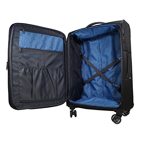 travelite Capri 4-Rad Trolley 76cm Sensation in Preis und Leistung! Die Serie Capri von travelite ist das perfekte Weichgepäck mit toller Ausstattung. Edles, strapazierfähiges Material wurde zu Taschen und Koffern mit vielen Außentaschen und funktioneller Innenausstattung verarbeitet. Außenausstattung: – arretierbares Teleskopgestänge, zweiarmig – 4 leicht laufende, in alle Richtungen drehbare Doppelrollen – Kantenschutz – Bodengriff – gepolsterter Tragegriff oben – gepolsterter Tragegriff seitlich – aufgesetzte Reißverschluss-Vortasche – Reißverschluss-Vortasche – Reißverschluss-Vorfach – Verschluss des Koffers: Reißverschluss mit – integriertes TSA-Zahlenschoss – Rundum-Reißverschluss-Dehnfalte – Adressschild Innenausstattung: – Reißverschluss-Hauptfach – erweiterbares Packvolumen – Packgurte – separates Wäschefach – Reißverschluss-Innentasche – Schuheinteilung – Design-Innenfutter