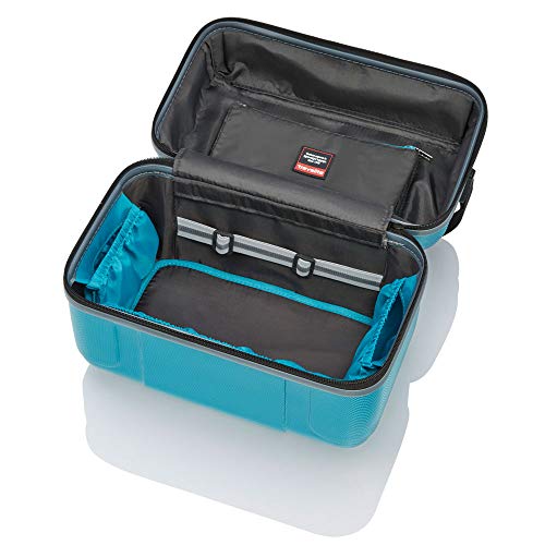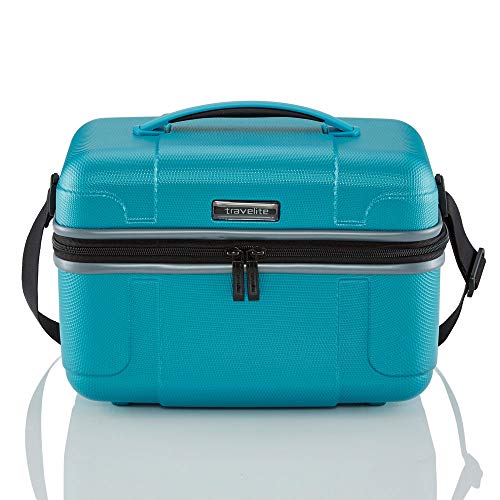 travelite Vector Beautycase Vector – die großvolumige, moderne travelite Hartschalen-Gepäckserie aus ABS neu überarbeitet. ABS ist ein Werkstoff, der sich durch Schlagfestigkeit und hohe Oberflächenhärte auszeichnet. Daher ist dieser Kunststoff optimal für kratzfeste und strukturierte Oberflächen geeignet. Durch das unverkennbare VECTOR Design ? welches aus der Anwendung moderner Formensprache in Verbindung mit in die Form integrierten schützenden Elementen entsteht – ist diese Serie nicht nur besonders stabil, sondern auch individuell und somit immer einfach und sofort zu erkennen. Außenausstattung: – mit Polsterung unterlegter Tragegriff, Griffhöhe ca. 2cm – abnehmbarer, in der Länge verstellbarer Schultergurtbis 60cm Höhe über dem Beautycase mit – Schulterpolster – ABS-Hartschalen bieten Schutz für empfindlichen Inhalt – Rundum-Reißverschluss mit gegenläufigen Zippern – auf ein Trolleygestänge aufsteckbar Innenausstattung: – Reißverschluss-Hauptfach mit – elastische Fixierbänder für z.B. Flacons – 3 Seitensteckfächer mit elastischem Bund – Reißverschluss-Fach im Deckel