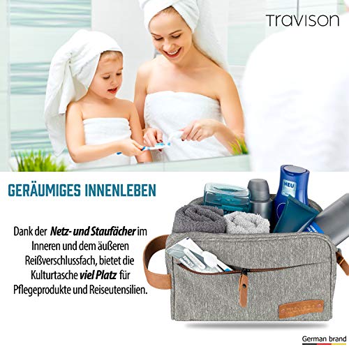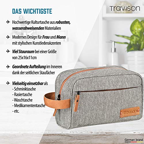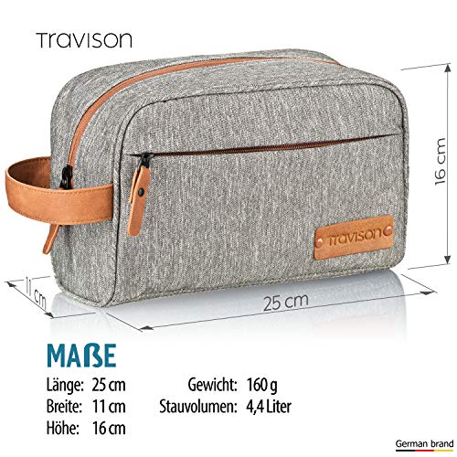 Produktbeschreibung: Kulturbeutel von TRAVISON – Hochwertig, geräumig und modern. Die perfekte Reisetasche für Frau und Mann! Mit der Kulturtasche von Travison ist endlich Schluss mit der Unordnung im Reisekoffer! Die Reisetasche bietet ausreichend Platz für Ihr Reiseequipment. Dank der vielen kleinen und großen separaten Staufächer wird ein Durcheinander vermieden Der Kulturbeutel von Travison ist auch ideal als Schminktasche oder Waschtasche geeignet. Die wichtigsten Vorteile auf einen Blick: Großes Hauptfach für große Dinge, wie Shampoo, Duschgel, Rasierschaum, Haarspray, Bodylotion und Co. Zwei Netzfächer im Hauptfach für die kleinen Reiseutensilien Großes Einschubfach im Hauptfach für weiteres Equipment, wie Zahnbürste und Zahnpasta Das große separate Reißverschlussfach an der Front dient für flache Dinge, wie z.B. Reisepass, Geldkarte, usw. Hochwertiges Material und erstklassige Verarbeitung zeichnen diesen Kulturbeutel aus Robuste Reißverschlüsse halten Ihr Equipment sicher in der Tasche Dank der modernen Stoffe und den kleinen Akzenten aus Kunstleder wird Ihre Kulturtasche im Bad oder am Strand zum echten Hingucker! Produkteigenschaften: LxBxH: 25x16x11cm Gewicht: 160gr Staufächer: 1x großes Hauptfach; 2 Netzfächer; 1x langes Einschubfach; 1x Reißverschlussfach Stauvolumen: 4,4 Liter Farbe: Hellgrau / Dunkelgrau / Schwarz Material: 600D (hellgrau) / 300D (dunkelgrau, schwarz)