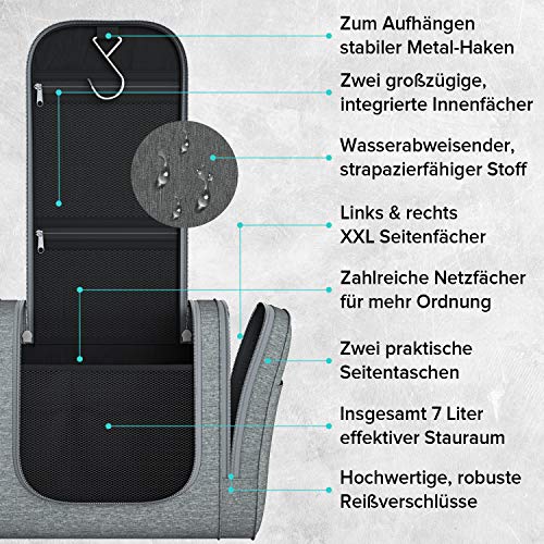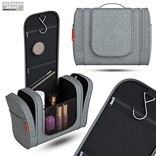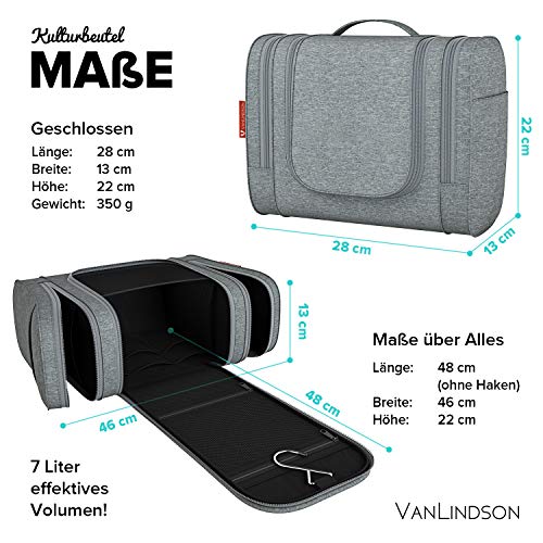 „VanLindson Kulturbeutel – Weil du zu smart bist für eine herkömmliche Waschtasche!“ Warum VanLindson? 1. UNISEX – Perfekt geeignet für Frauen, Männer und Kinder2. HOCHWERTIGSTE MATERIALIEN – Für maximale Langlebigkeit3. JEDE MENGE PLATZ – Insgesamt 7 Liter! Stauraum4. ALLES IM BLICK – Zahlreiche übersichtlich und logisch angeordnete Fächer und Innentaschen5. ZUM AUFHÄNGEN – Stabiler & robust verarbeiteter Metal-Haken6. ORGANIC DESIGN – Hochwertiger, strapazierfähiger Stoff im modernen „Frozen-Style“7. WASSERABWEISEND – Schützt dein Reise-Equipment vor Wasser8. FANS, FANS, FANS – Mehr als 5.000 begeisterte VanLindson-Fans können nicht irren! Spezifikationen Maße (geschlossen): 28 x 22 x 13 cm (LxHxB) Maße (offen): 48 x 22 x 46 cm (LxHxB) Volumen: ca. 7 Liter Gewicht: 350 g Material: wasserabweisend Gratis Ebook: 55 Travel Hacks, um Zeit, Geld & Nerven zu sparen 100% Zufriedenheits-Garantie Wir von VanLindson sind ein junges Unternehmen, das sich speziell auf hohe Qualität, langlebige Produkte und einzigartigen Kundenservice spezialisiert hat.Unser Versprechen: Bei jedem Problem, jeder Frage und jedem Anliegen melden wir uns innerhalb von 24h bei dir und werden eine individuelle Lösung für dich finden. Nimm deinen VanLindson Kulturbeutel mit auf dein nächstes Abenteuer und hol ihn dir jetzt mit einem Klick auf „In den Einkaufswagen“ nach Hause!