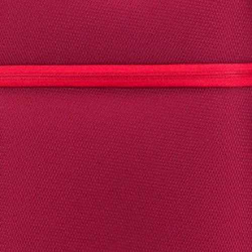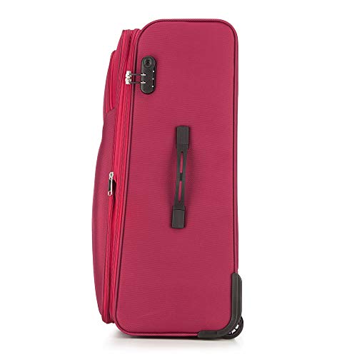 Es hat zwei Räder und eine Fußstütze, die den Koffer stabil hält.